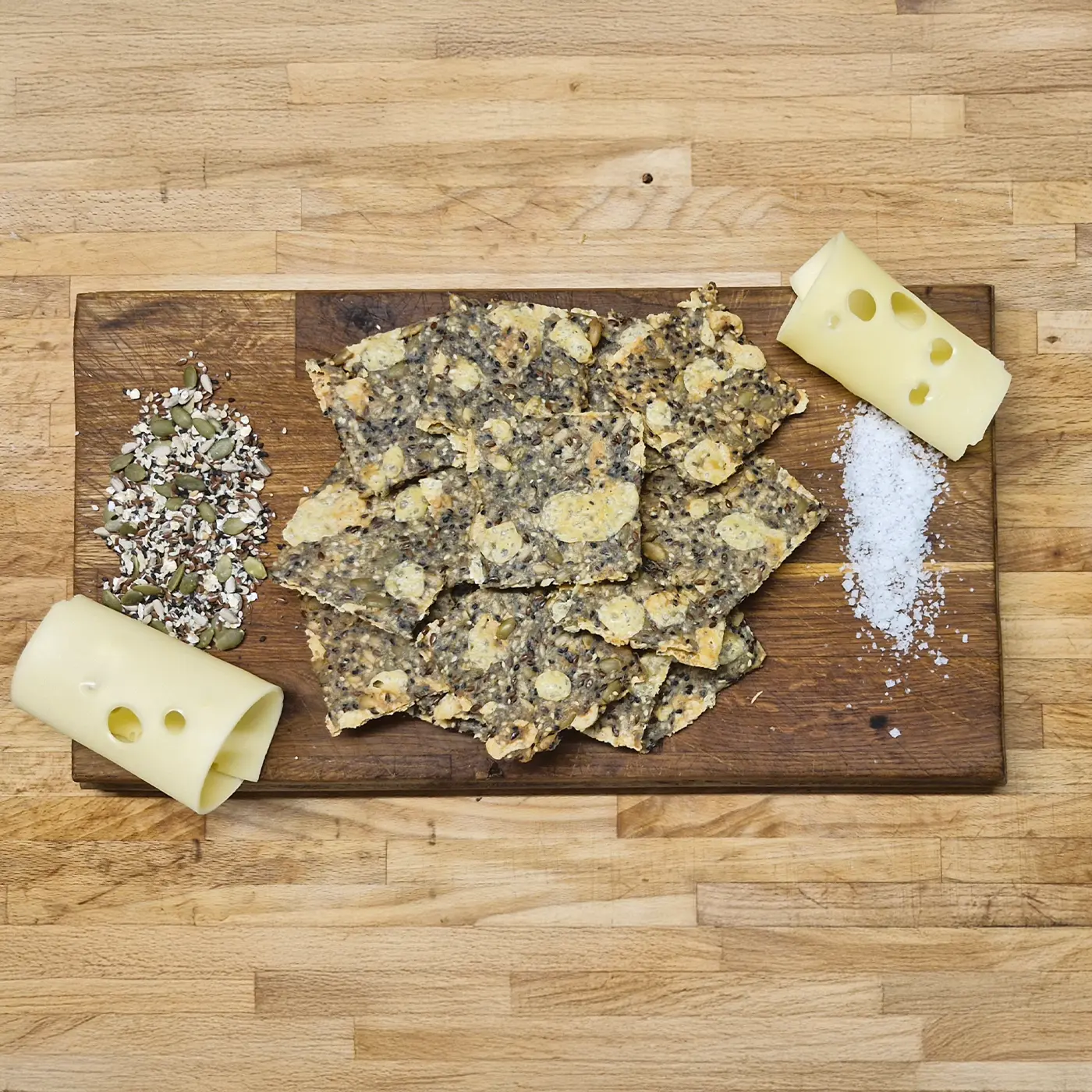 Pack of 24 – Blend of organic flours: Strong White (14% protein), Wholegrain, Rye – 7 different organic seeds: Pumpkin, Sunflower, Flax, White and Black Sesame, Hemp seeds, plus organic rolled oats, extra virgin olive oil, cracked black pepper, pink Himalayan rock salt & filtered water – The best cracker you will ever taste! – Same seeded cracker base with Emmental Cheese through this amazing crispbread. Our Emmental Seeded Crackers offer a cheesy crunch. Perfect with your favourite sourdough, these real crackers are crafted with care (pack of 24).